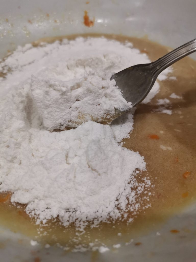 Avec une fourchette, nous mélangeons bien les ingrédients et ajoutons ensuite la levure et la farine tamisées.