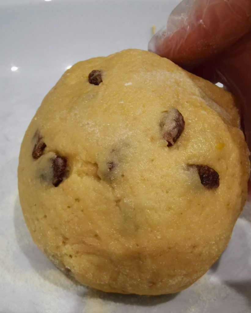 Détachez de petits morceaux de pâte que vous roulerez entre vos mains pour former les boules de biscuit.