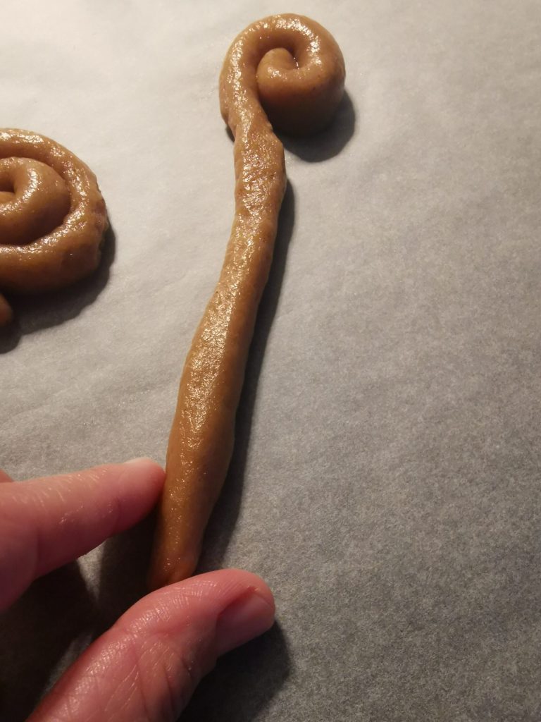 • Prenez une plaque sur laquelle vous aurez étalé du papier sulfurisé. Nous allons y déposer nos petits biscuits escargot, au fur et à mesure que nous leur donnerons forme.