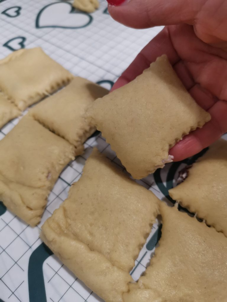 Les biscuits fourrés à la confiture et à la ricotta sont nés d’un reste de pâte sablée que je voulais utiliser non pas pour de simples petits biscuits, mais je voulais réaliser quelque chose qui puisse être farci, c’est comme ça qu’ils sont arrivés, cette sorte de chaussons fourrés.