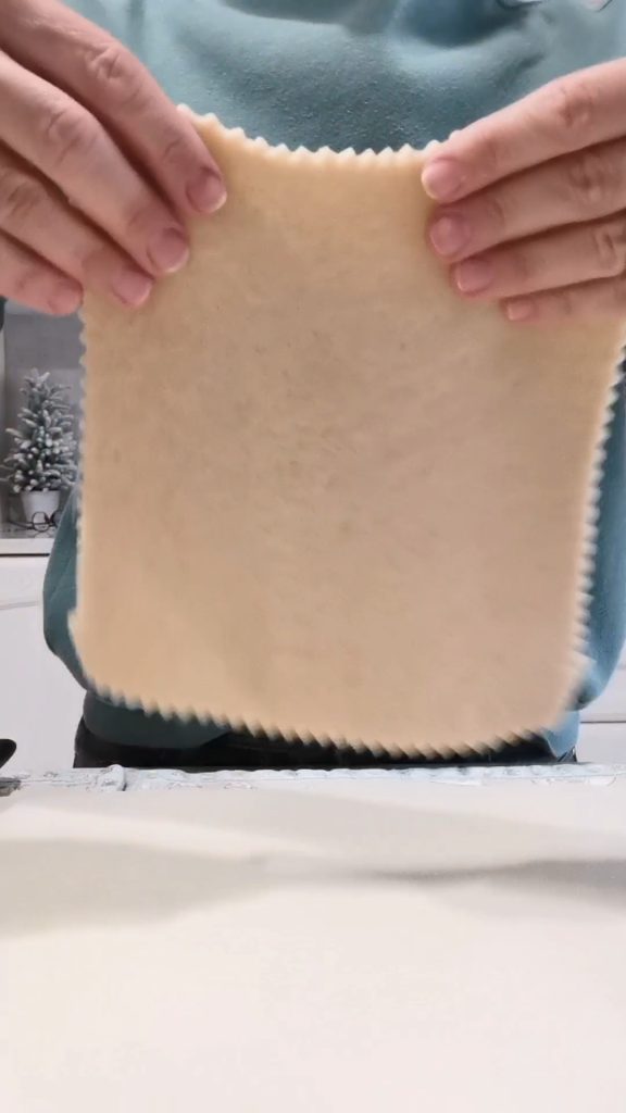 J’ai laissé la pâte légèrement plus épaisse, coupé la pâte avec une roulette, comme si je devais découper des « bugnes » pour être clair, j’ai créé un rectangle et après avoir incisé les bandes, j’ai pris un emporte-pièce pour faire le trou dessus.