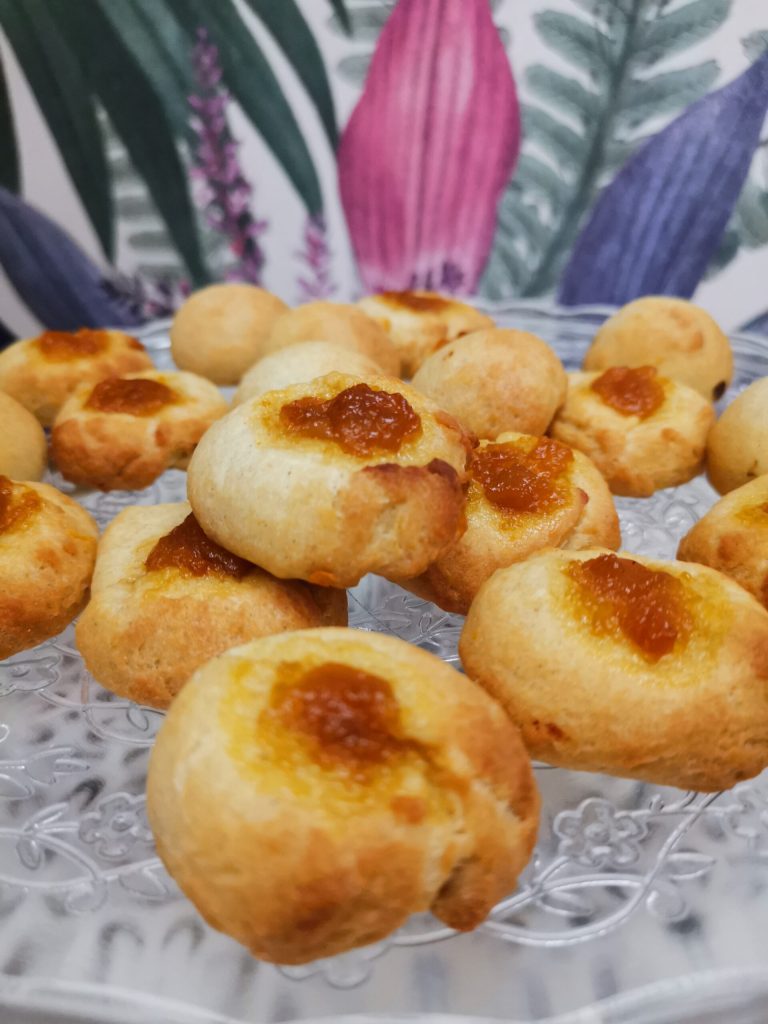 J’ai fait un trou au centre du biscuit avec le doigt que j’ai ensuite rempli avec la confiture préférée.