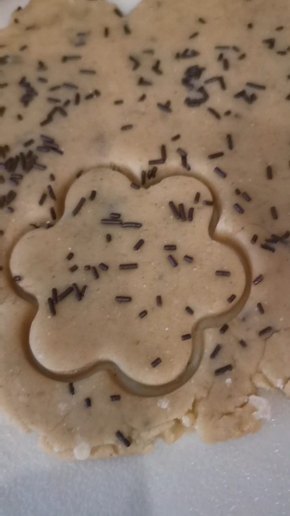 • Une fois la pâte étalée avec le rouleau à pâtisserie, pour recréer un effet moucheté sur la pâte du biscuit, j’ai pris des vermicelles au cacao/chocolat et je les ai répartis dessus puis j’ai repassé le rouleau pour les faire pénétrer à l’intérieur. Comme vous pouvez le voir sur la photo, le chocolat ne fondra pas malgré la cuisson.