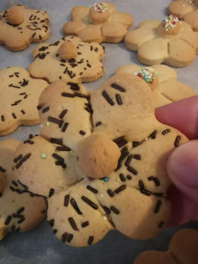 Maintenant, préparons les fleurs. Vous aurez besoin d’un emporte-pièce en forme de fleur, comme celui pour les canestrelli. Il suffira d’étaler la pâte, découper la forme puis détacher un petit morceau de pâte du pâton et créer une petite boule à ajouter au centre. Pour faire adhérer la boule, j’ai humidifié avec un peu d’eau la surface du biscuit puis ajouté la boule. Pour donner la forme aux pétales, j’ai utilisé un cure-dents, en découpant ainsi la pâte pour former un petit sillon.