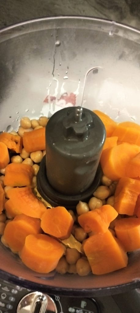 Dans le hachoir, insérez les carottes et les pois chiches et commencez à mixer.