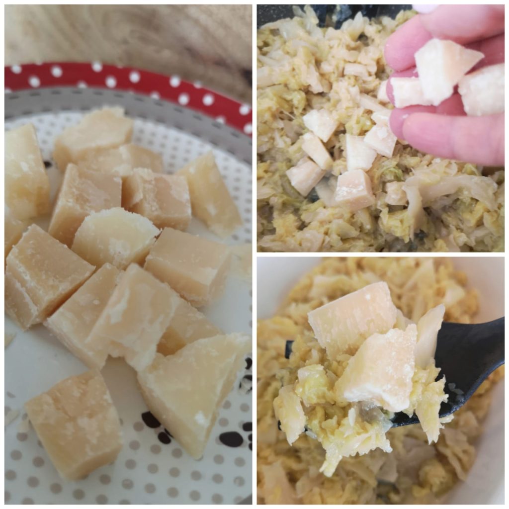À ce stade, éteignez le feu et ajoutez les dés de Parmigiano Reggiano.