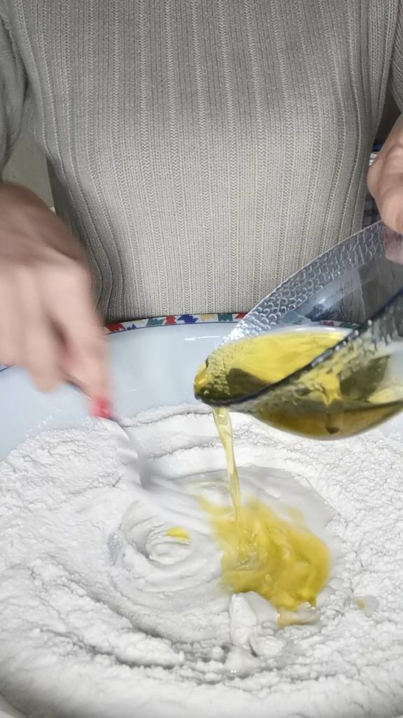 Faites un puits au centre de la farine et ajoutez ensuite nos liquides. L’eau, l’huile et le vin rouge.