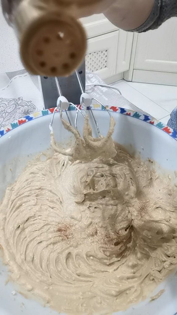 Ajoutons aussi la cannelle et le lait. Continuons à mélanger. À ce stade, avant de verser le sachet de levure, j’abandonne le fouet et commence à mélanger avec la « spatule ».