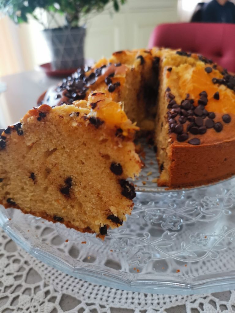 Maintenant, prenons le moule, beurre et farinez-le. J’ai utilisé un moule de 22 cm de diamètre. Répartissez la pâte à l’intérieur et décorez avec de nombreuses tranches d’orange et pépites de chocolat. Enfournez dans un four préchauffé à 180 degrés, mode statique pendant environ 40/45 minutes.