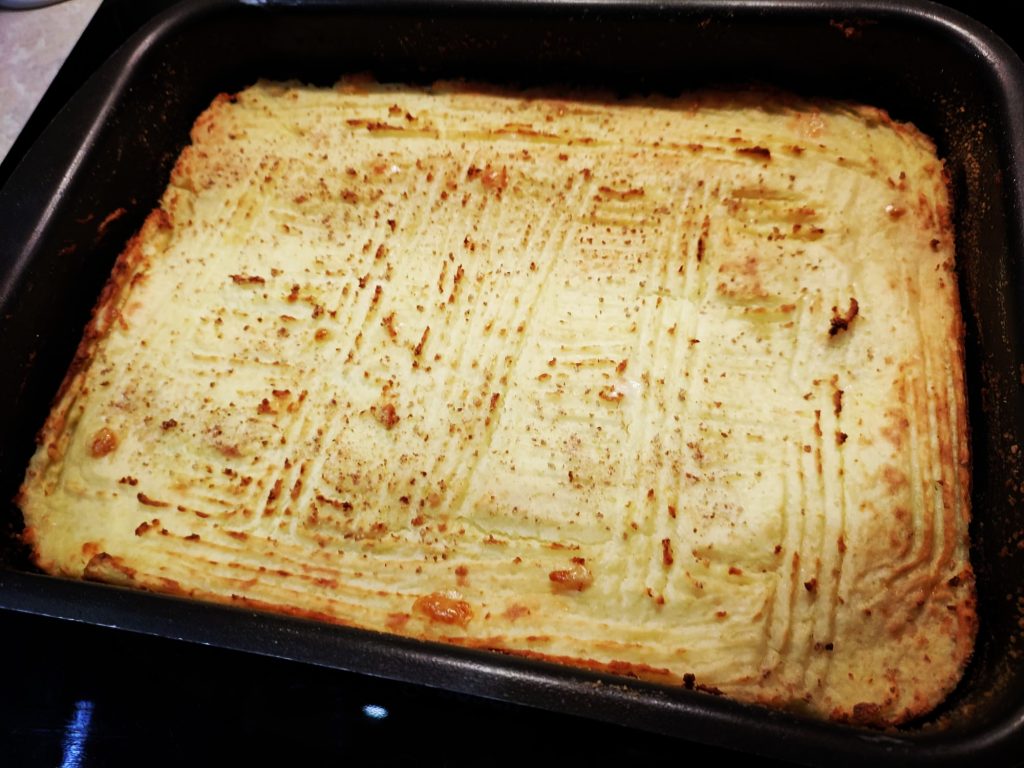 Une fois étalée dans le plat, ajoutons sur le dessus une pincée de fromage parmesan et une de chapelure. Mettez au four à 170 degrés, mode ventilé pendant environ 40 minutes.