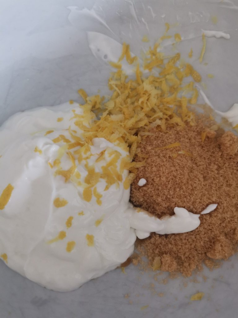 Dans un saladier, mélangeons ensemble le yaourt et le sucre.