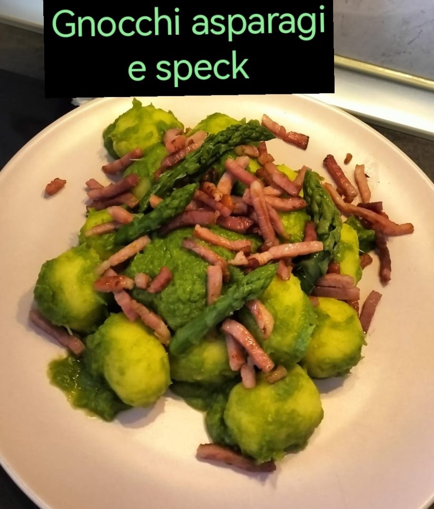 Préparons le plat où nous placerons les gnocchi mélangés à la crème d’asperges et garnirons sur le dessus avec du speck croustillant et des pointes.