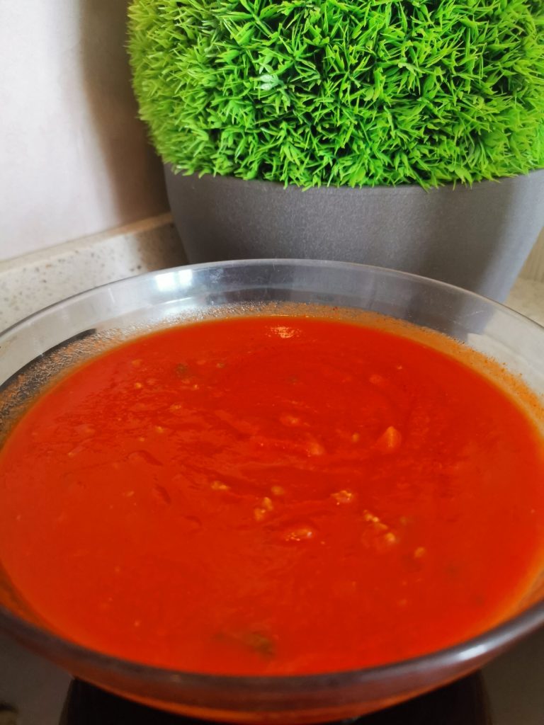J’ai pris la casserole et j’ai mis à l’intérieur, la carotte finement coupée, l’oignon, l’ail en petits morceaux, l’huile d’olive et le sel. J’ai fait revenir ces ingrédients et j’ai ensuite ajouté 250 grammes de viande hachée. Je l’ai fait revenir avec le reste, j’ai déglacé avec du vin rouge (un demi-verre) ajouté la sauce tomate, le sel, la pointe d’une cuillère à café de sucre et du basilic.