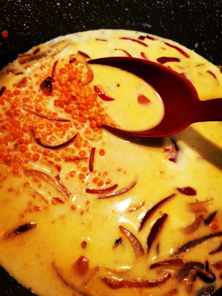 Ajoutez les épices, le curry et le paprika et mélangez bien le tout. Ajoutez les lentilles (préalablement rincées sous l’eau courante), le lait et la pulpe de tomate.