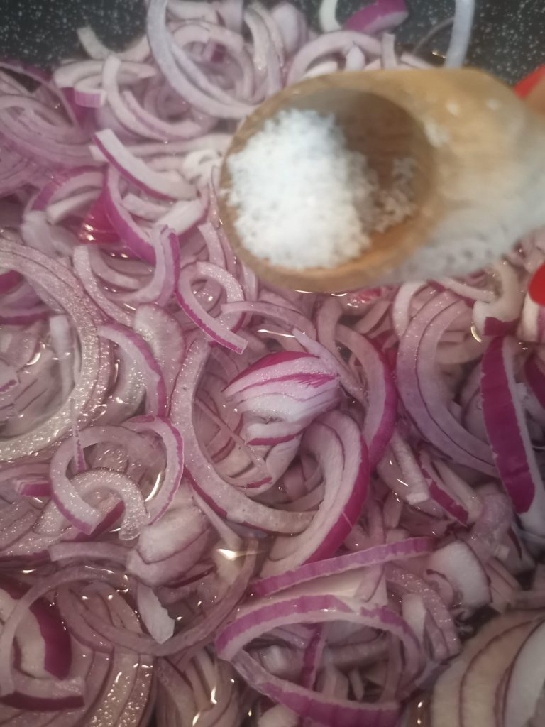 • Comme je vous le raconte dans la vidéo, cliquez ici à côté pour la voir ➡️ VIDÉO OMELETTE SANS ŒUFS faites cuire les oignons finement tranchés avec du sel, de l’eau et de l’huile.