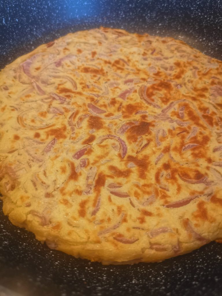 Je l’ai réalisée avec de la farine de pois chiches, qui donnera également cette couleur jaunâtre, ce qui nous fera penser que l’omelette « sans œufs » est identique à la classique.