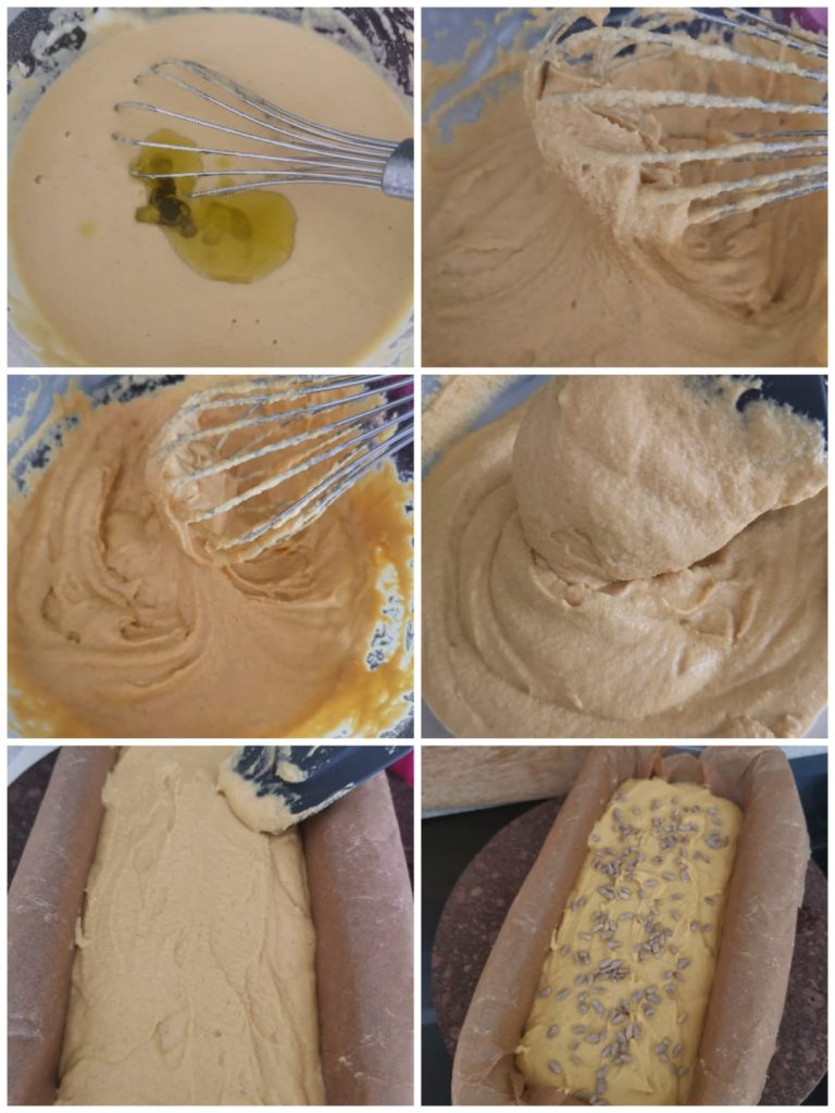 Obtenez un mélange lisse mais collant que vous versez dans un moule à cake garni de papier cuisson (j’utilise celui compostable).