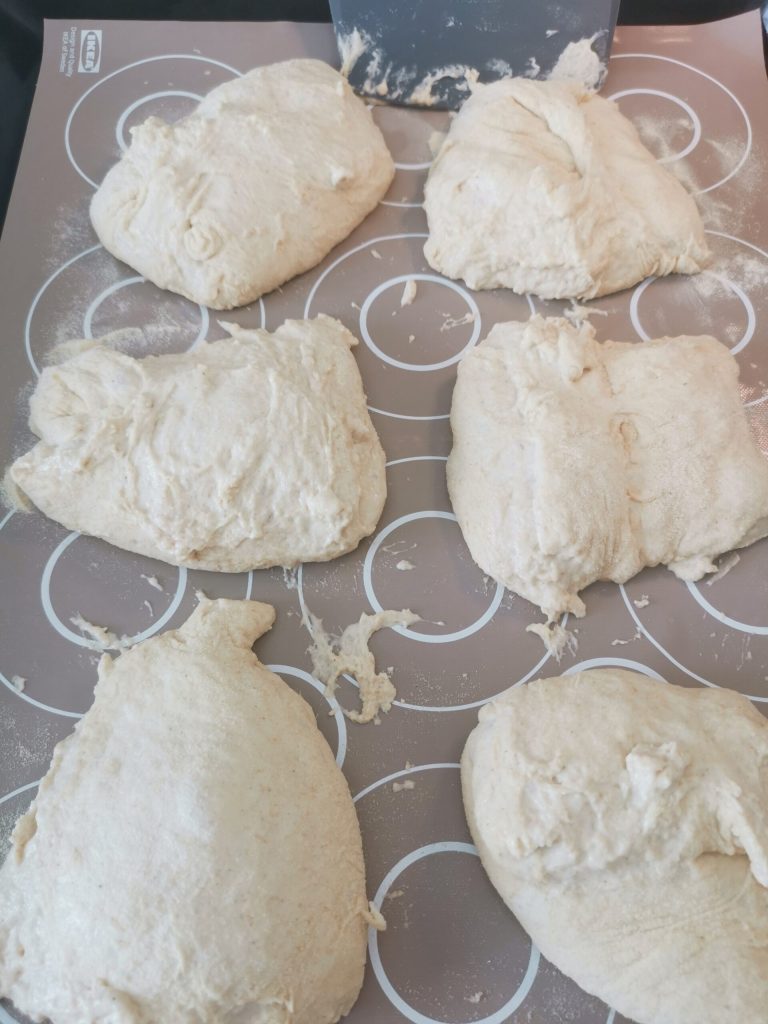 Maintenant avec une corne farinée, coupons la pâte en 6 morceaux. Si elle a tendance à coller et que les morceaux de pain ciabatta sont de travers, aucun souci, ajustons-les un peu à l’aide de mains farinées.