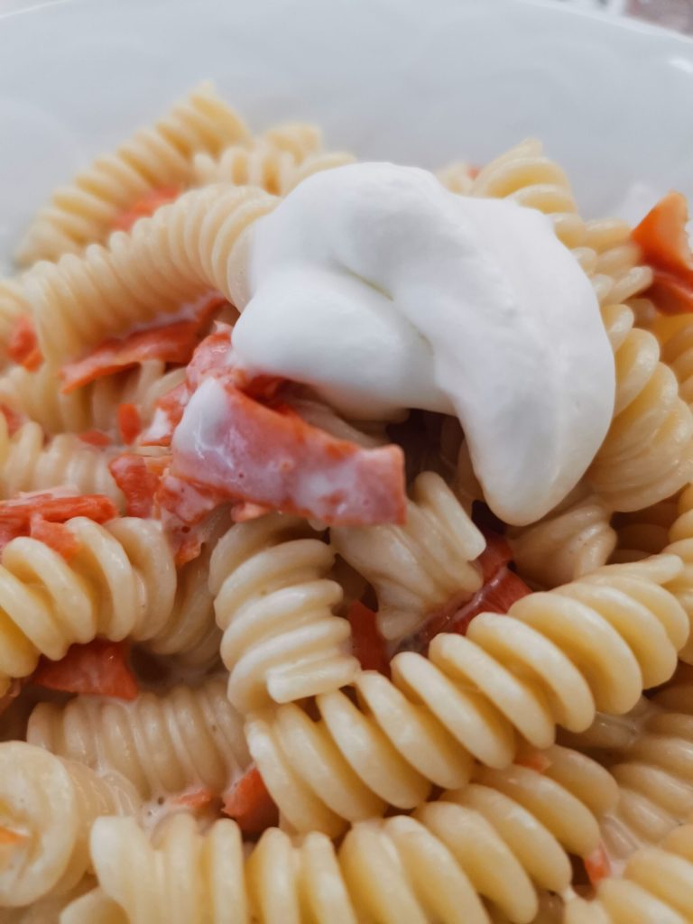 Égouttons les fusilli et versons-les dans notre poêle où nous avions précédemment cuit le saumon. Ajoutons également la crème.