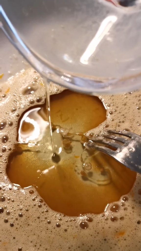 Dans un récipient, nous allons mélanger les œufs et le sucre. Nous ajoutons aussi le zeste de citron ou d’orange. Ensuite, nous ajoutons l’huile et une pincée de sel. Avec une fourchette, nous mélangeons bien.