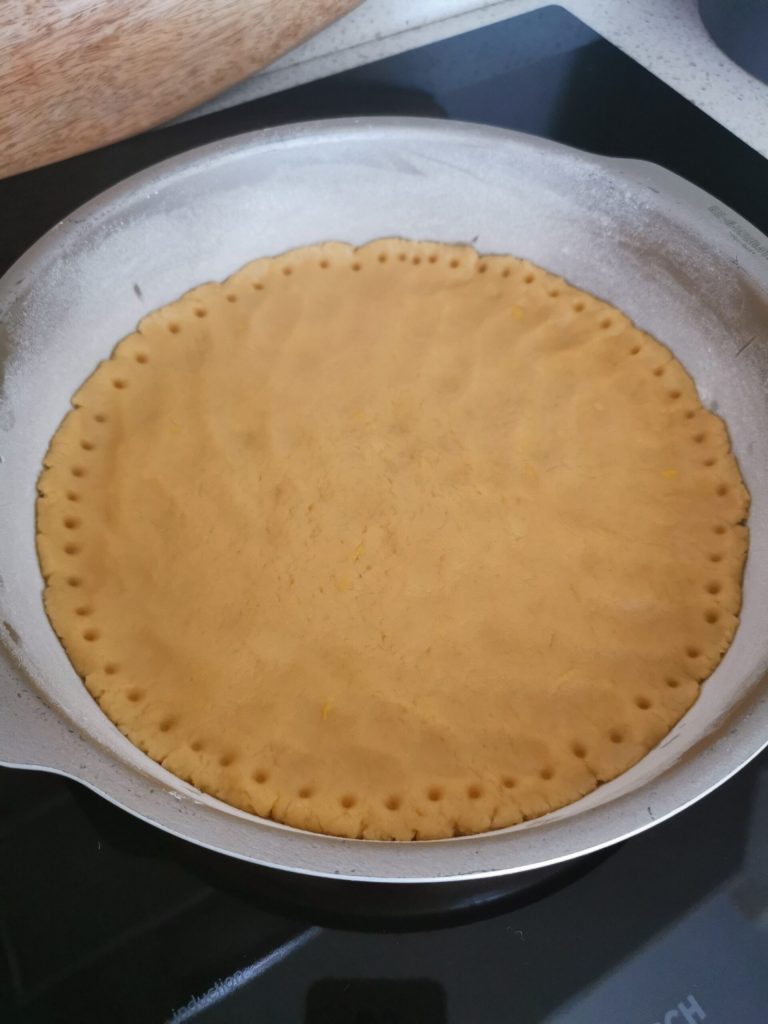 J’ai étalé la pâte dans le moule et avec les dents d’une fourchette, j’ai piqué le bord.