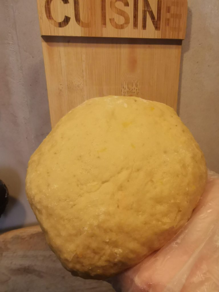 Quand la pâte commencera à ne plus être travaillable avec la fourchette, pétrissez à la main jusqu’à former une boule.