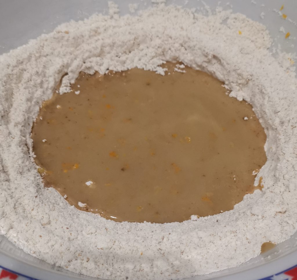 Après les avoir mélangés, avec une fourchette créez au centre le classique puits, dans lequel vous verserez l’eau et l’huile.