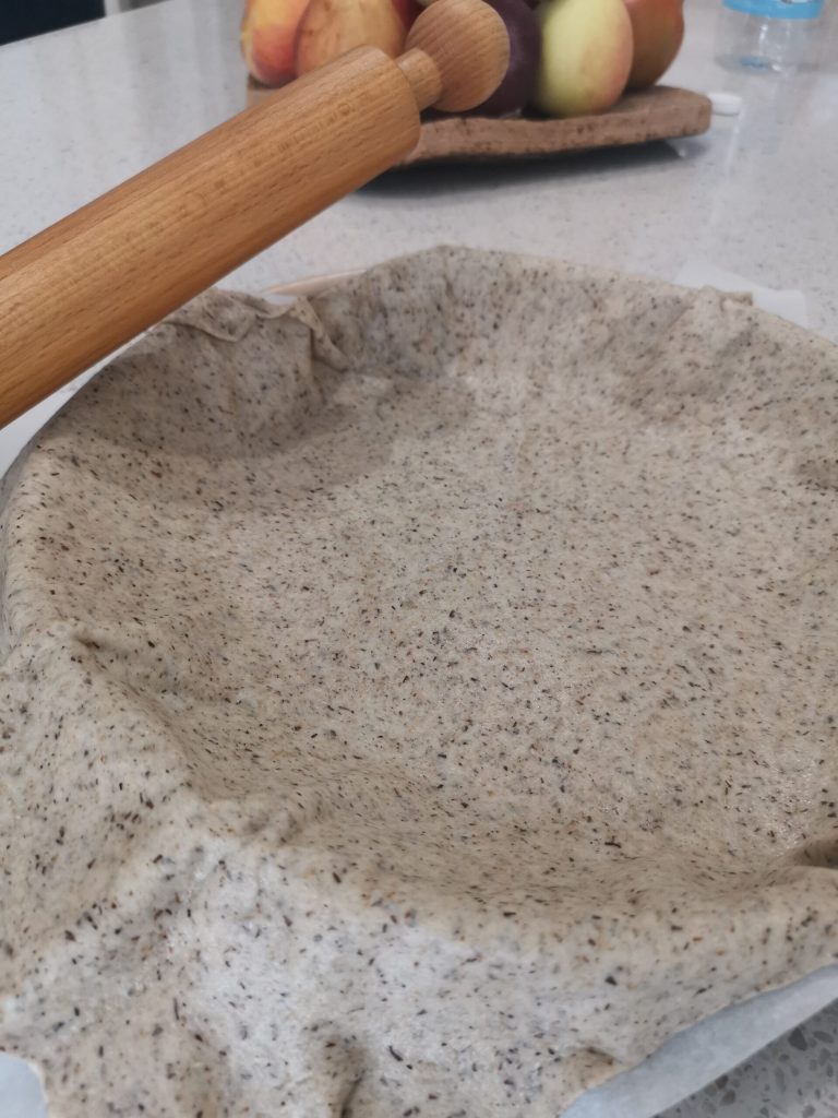 Maintenant, reprenons la pâte et amusons-nous à l’étirer avec le rouleau, aussi fin que nous l’aimons. Je l’étire généralement en voile, j’aime ça comme ça, mais vous faites à votre goût. Une fois étalée sur du papier sulfurisé et placée dans le moule, nous perçons le fond et commençons à garnir d’une couche de poivrons et de ricotta.