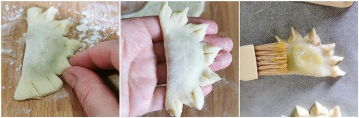 Si vous souhaitez des biscuits soleils, il suffit de suivre le tutoriel, sinon donnez la forme qui vous plaît le plus. Déposez-les sur une plaque à pâtisserie recouverte de papier cuisson et badigeonnez avec l’œuf battu.