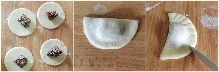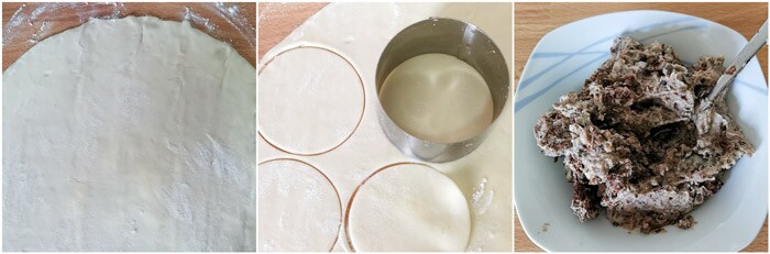 À l’issue du temps, sortez la boule du réfrigérateur et étalez une pâte, ne la faites pas trop fine. Avec un emporte-pièce découpez les biscuits, placez au centre de chaque biscuit une cuillère à café de crème ricotta.