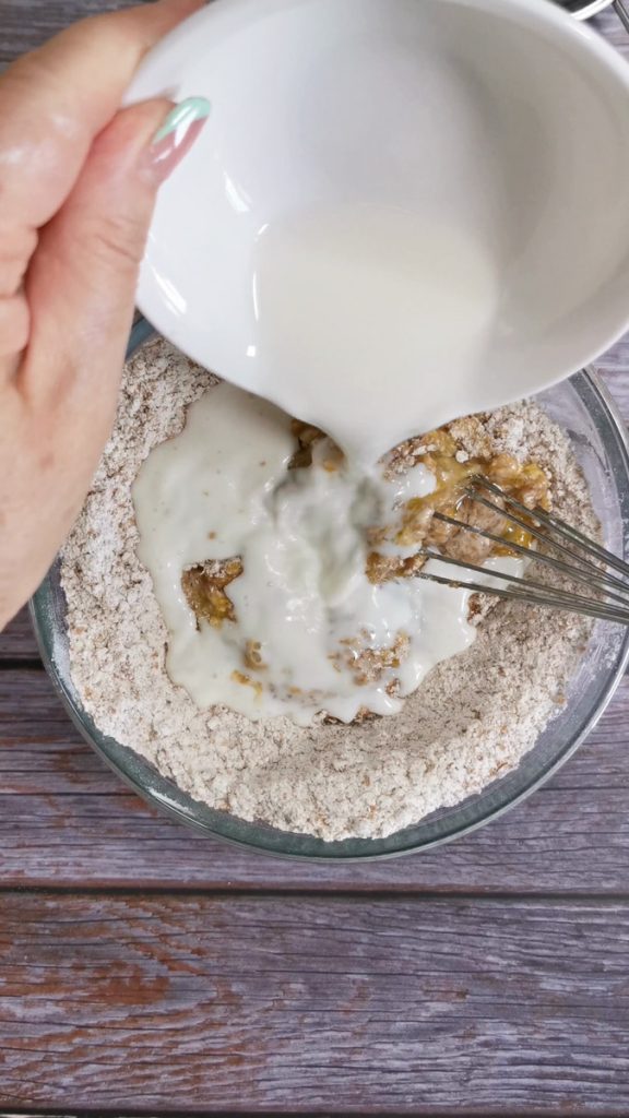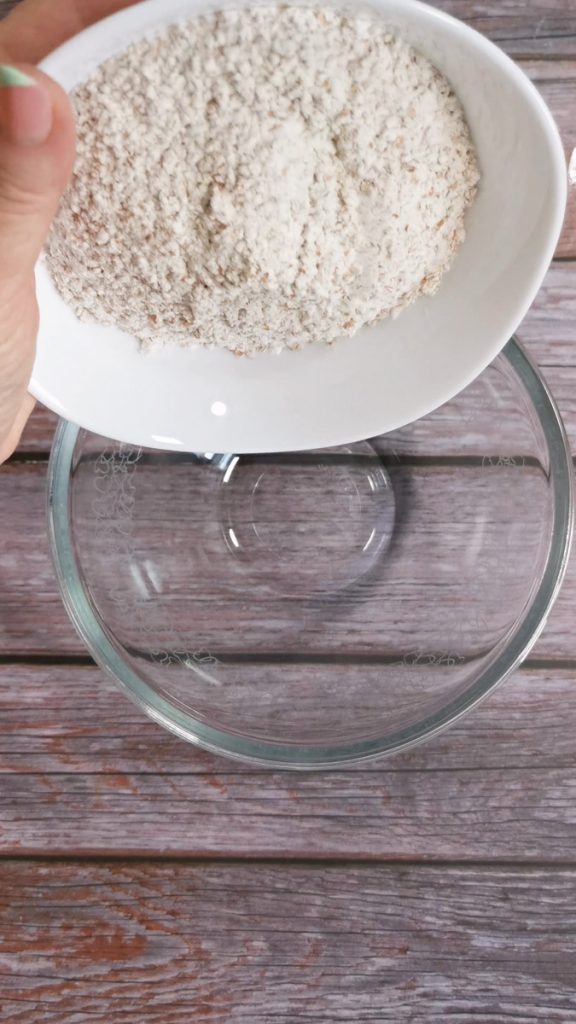 Dans un grand bol, placez la farine complète, la farine d’amande et ajoutez la vanilline.
