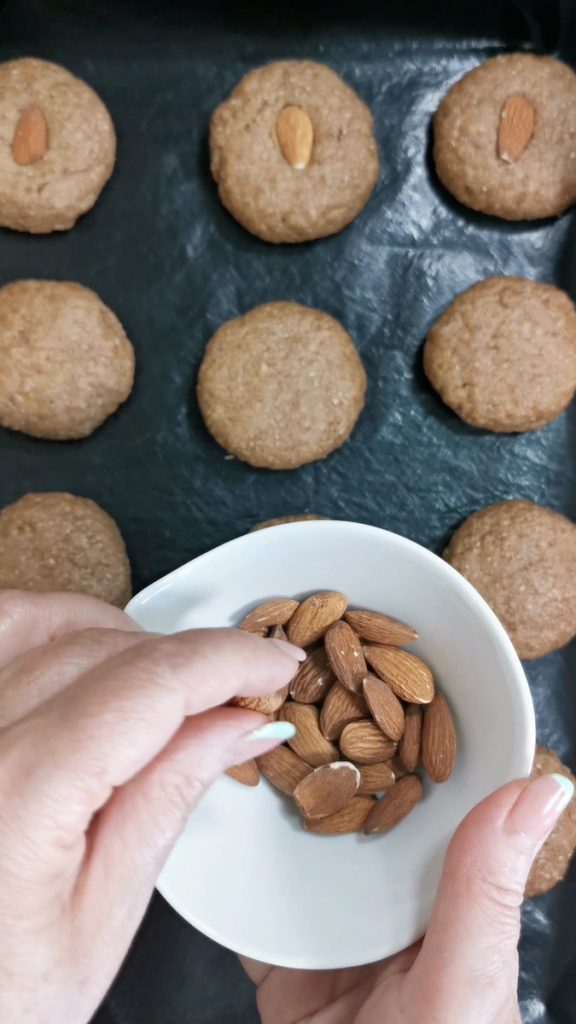 Disposez les boules sur une plaque recouverte de papier cuisson ou un tapis de cuisson. Aplatissez les boules et décorez chaque biscuit avec une amande, faites cuire au four statique à 180° pendant environ 20 minutes. Rappelez-vous toujours que le temps de cuisson est indicatif, donc ajustez-vous toujours avec votre four. Une fois les biscuits complets sortis du four, laissez-les refroidir et bonne gourmandise!