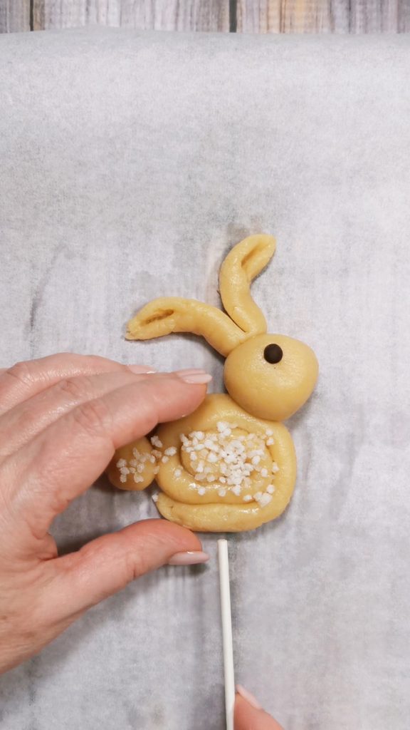 Pour finir, si vous souhaitez les réaliser comme des cake pops, insérer le bâtonnet et ajouter une pépite de chocolat pour créer l’œil. Badigeonner le tout avec un peu de blanc d’œuf et décorer avec du sucre en grains. Déposer les biscuits sur une plaque recouverte de papier sulfurisé et cuire au four statique à 180°C pendant environ 15/20 minutes.
