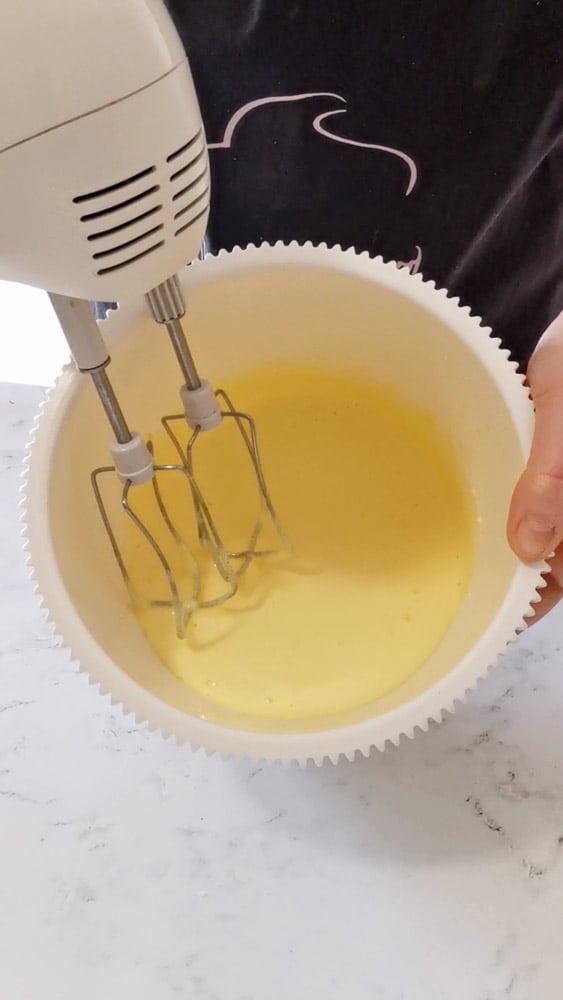 Dans un bol, battez les œufs avec le sucre à l’aide du fouet électrique pendant environ 10/15 minutes. Ils doivent doubler de volume et devenir bien mousseux.