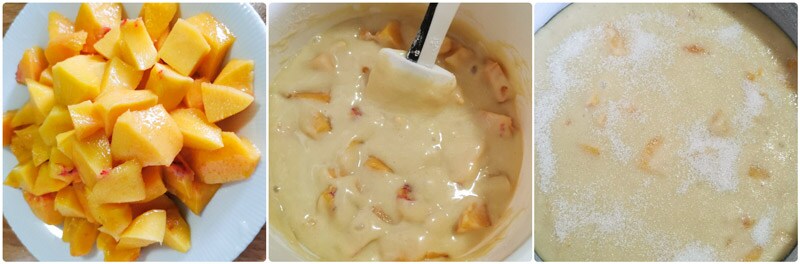 Ajoutez également l’extrait de vanille. Ensuite, épluchez les pêches, coupez-les en dés et ajoutez-les à la pâte. Tapissez le moule de papier cuisson et versez le mélange à l’intérieur, essayez de bien le niveler. Faites cuire au four à 180° pendant environ 40 minutes, attention à la cuisson qui pourrait vous tromper à cause des pêches, c’est pourquoi faites toujours le test du cure-dent. Rappelez-vous aussi que le temps de cuisson est indicatif, alors ajustez toujours avec votre four. Une fois refroidi, saupoudrez de sucre glace et dégustez votre gâteau aux pêches….. Bonne dégustation !