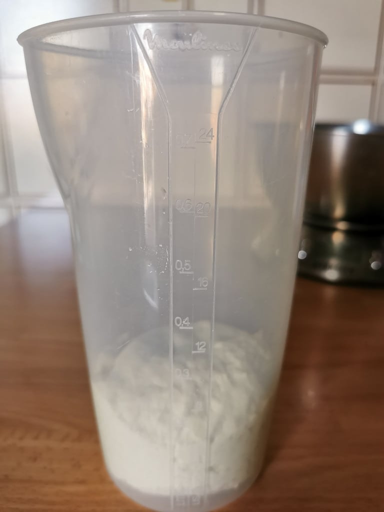 Commencez toujours par rafraîchir le levain naturel, je le prépare généralement tôt le matin. Ensuite, je laisse reposer le pâton à température ambiante dans un récipient couvert de film plastique pendant environ 3/4 heures.