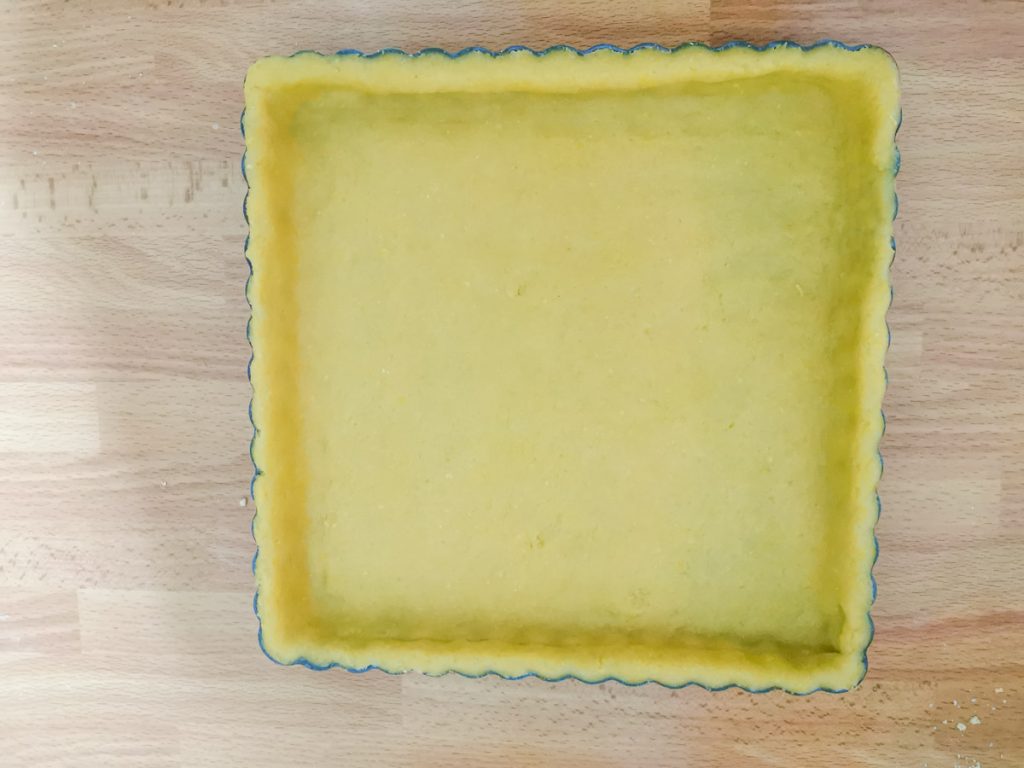 Maintenant, étalez une pâte d’environ 3/5 mm, beurrez le moule de 20×20 et tapissez-le de pâte sablée ; couvrez d’un film plastique et laissez reposer au frigo pendant environ une heure, afin que la pâte tienne bien la forme à la cuisson. Avec le reste de pâte sablée, découpez également des petits cœurs et disposez-les sur une assiette avec du papier sulfurisé, couvrez le tout avec le film plastique et laissez reposer au frigo. La pâte sablée peut être préparée la veille et conservée au frigo toute la nuit.