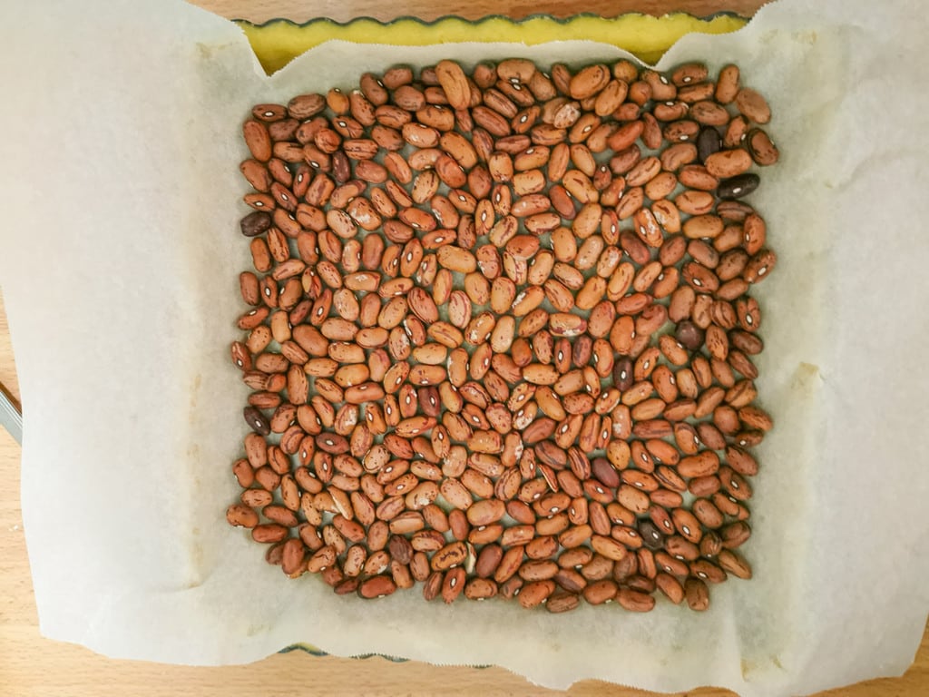Attention aux biscuits qui ne doivent pas brunir, maintenant sortez le moule avec la pâte sablée du frigo et piquez la pâte avec les dents d’une fourchette, posez dessus un papier sulfurisé et recouvrez de haricots secs. Ils doivent être bien compacts pour que la chaleur se diffuse uniformément. Maintenant, enfournez à 190/200° pendant environ 20 minutes.
