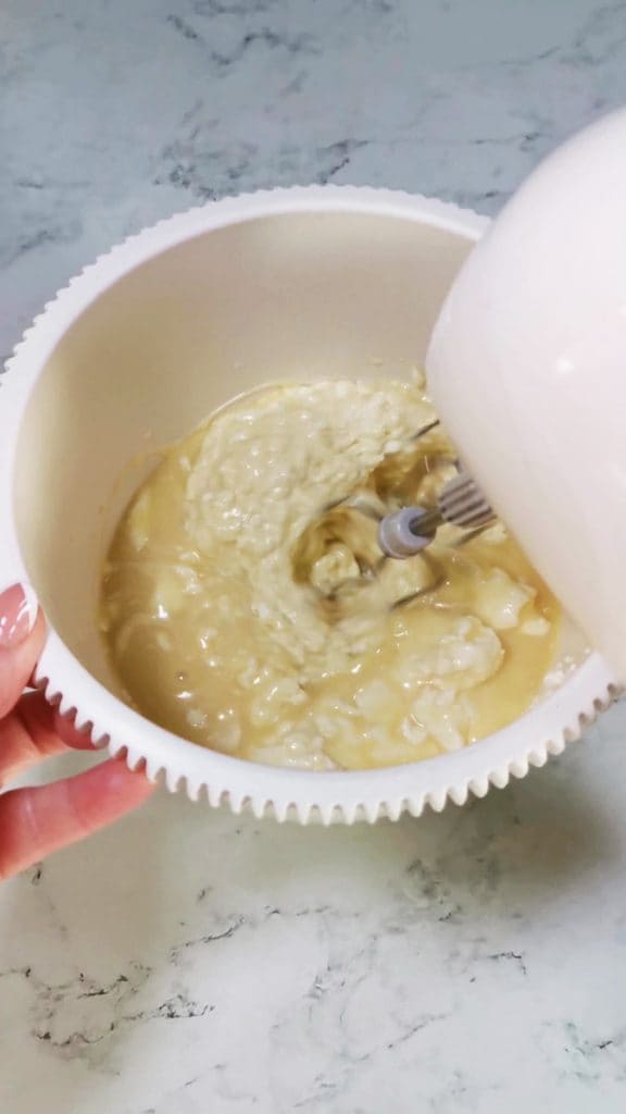 Maintenant, ajoutons la farine (tamisée au préalable) tout d’un coup, ce passage peut se faire tranquillement sans crainte de grumeaux.