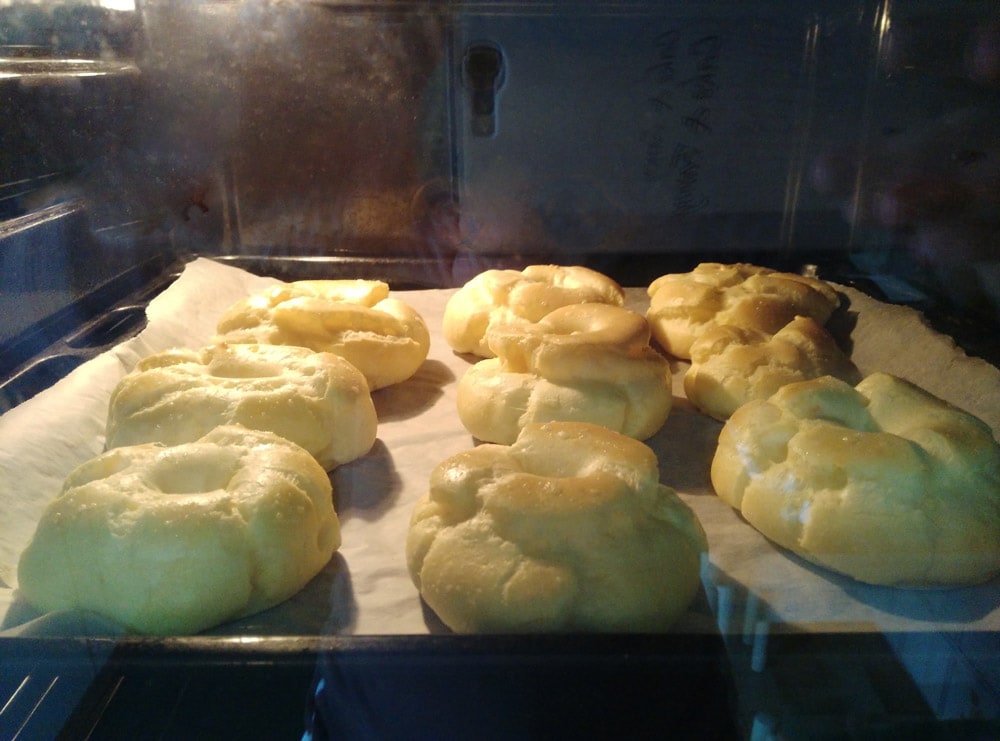 Maintenant, sur une plaque légèrement beurrée, faisons nos zeppoles, n’oublions pas de bien les espacer les unes des autres. Cuisez au four statique à 200° pendant 20 minutes, si vous utilisez le four ventilé, 190° suffisent. Vérifiez la cuisson après 10 minutes et faites attention à ce qu’elles ne brunissent pas trop, sinon baissez la température du four de 10°. Je préfère utiliser la cuisson statique, donc après les 20 minutes, mettons une cuillère en bois ou une boule de papier d’aluminium entre le four et la porte et poursuivons la cuisson pendant encore 10 minutes. À ce stade, elles doivent sécher à l’intérieur et se colorer à l’extérieur.