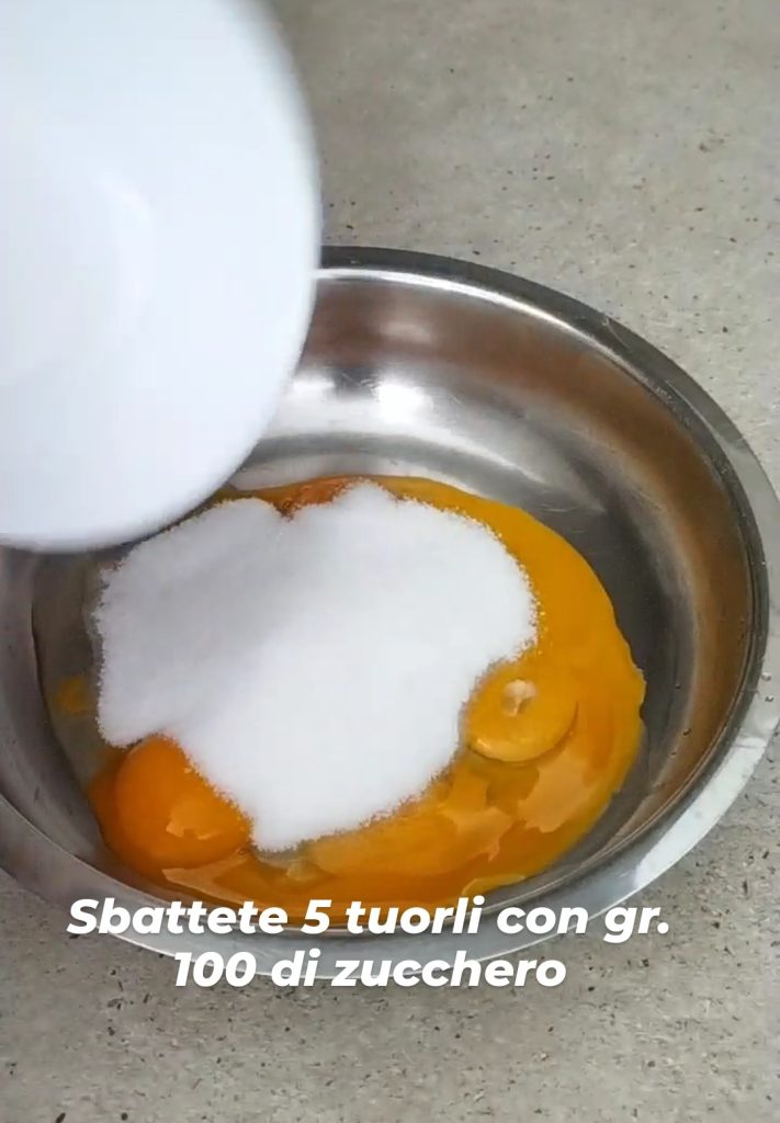 • Pendant ce temps, séparez les jaunes de 5 œufs et placez-les dans un bol, ajoutez le sucre et battez-les avec un fouet.