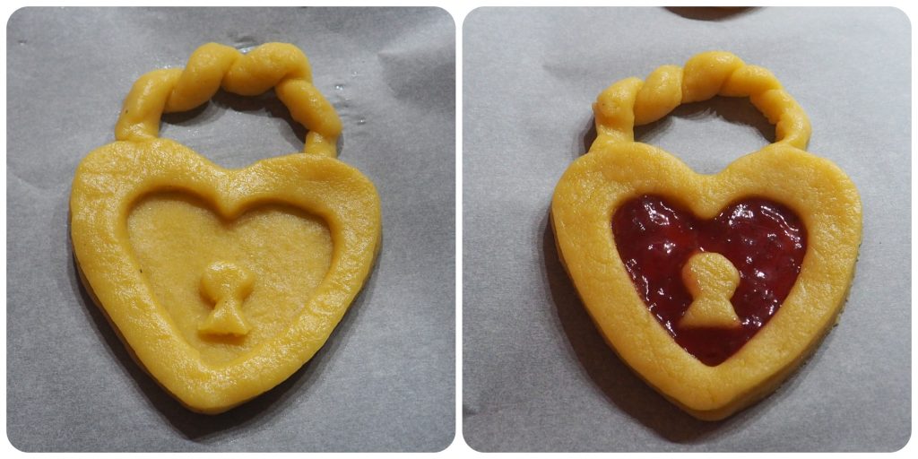 Faites attention car les biscuits simples pourraient cuire quelques minutes avant les cœurs avec cadenas car ils sont plus fins.