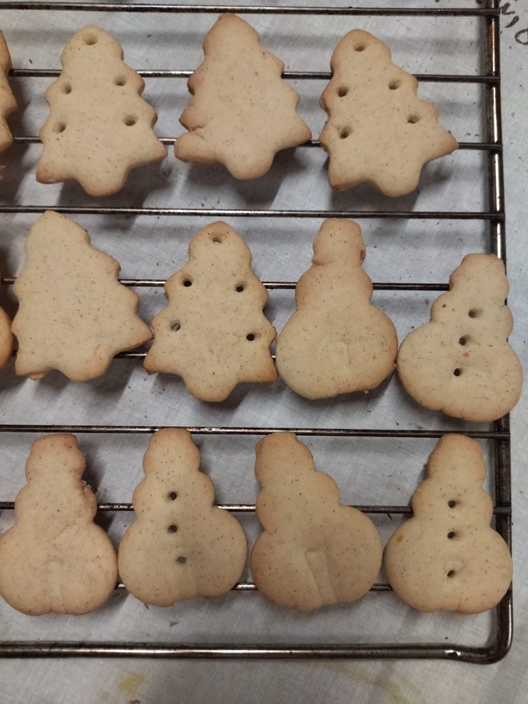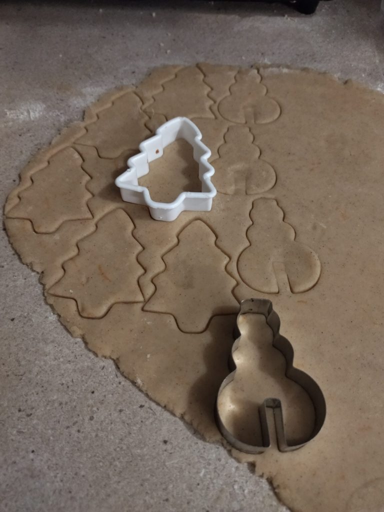 Farinez le plan de travail, divisez la pâte en 3 parts pour la travailler plus facilement. Étalez chaque part avec un rouleau à pâtisserie jusqu’à obtenir une épaisseur d’environ 2 cm. Avec des emporte-pièces, découpez vos biscuits : j’ai utilisé ceux en forme de sapin de Noël et de bonhomme de neige.