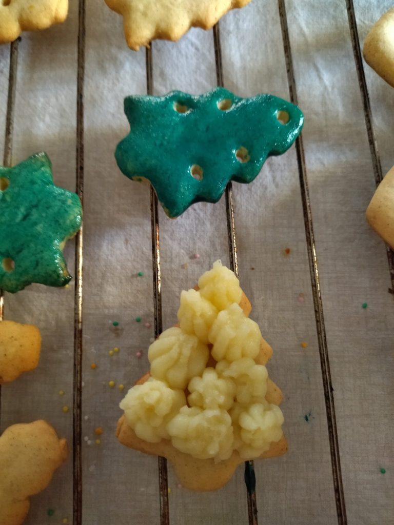 Les doses pour obtenir le colorant vert sont indicatives, ajustez-vous tant pour la quantité que pour la consistance. Je vous conseille d’en faire peu à la fois, de colorer les biscuits et si ce n’est pas suffisant d’en préparer plus.