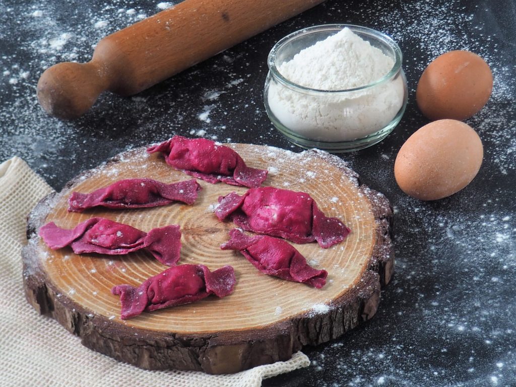 Ravioli à la betterave rouge farcis de pommes de terre et lardons