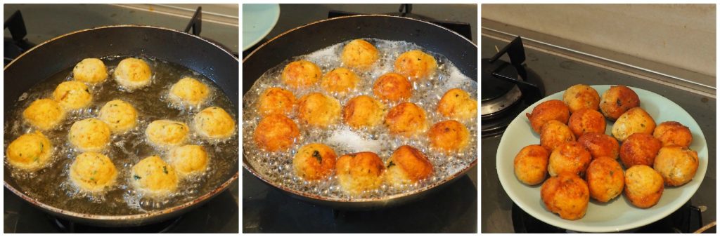 • Dans une poêle, mettez l’huile de graines, dès qu’elle est chaude, faites cuire les boulettes en les retournant jusqu’à ce qu’elles soient dorées.