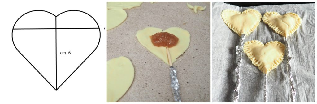 N’ayant pas d’emporte-pièce en forme de cœur des dimensions que je voulais, j’en ai fabriqué un avec du papier sulfurisé aux dimensions indiquées sur l’image. Les doses sont limitées car elles ont été calculées pour un brunch pour deux personnes. Bien sûr, à augmenter si le nombre de personnes est plus élevé.