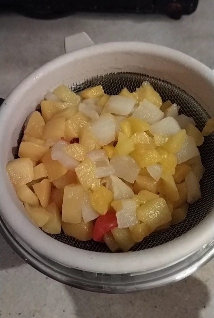Égouttez la macédoine de fruits au sirop en la mettant dans une passoire.