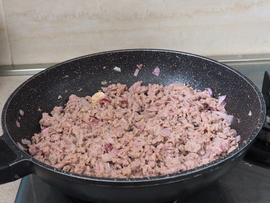 Pour la préparation de la farce : mettez dans une grande poêle un peu d’huile, l’oignon et l’ail finement hachés et faites-les revenir. Ajoutez la saucisse, dont vous avez préalablement retiré le boyau, essayez de l’émietter le plus possible avec les mains. Faites cuire pendant quelques minutes, puis laissez refroidir.