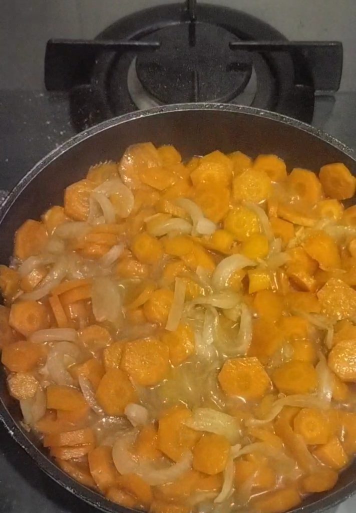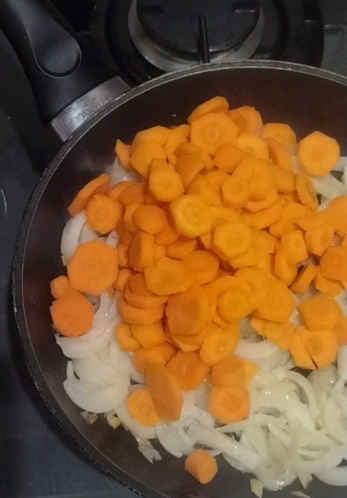 Une fois que l’oignon est légèrement fané, ajoutez les carottes.